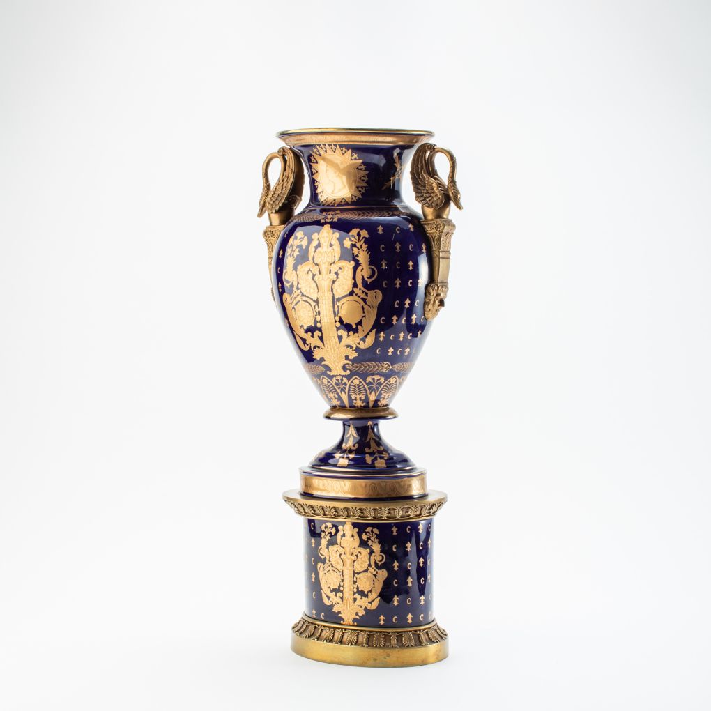 Pair of 19th-century vases. Made of ceramic, they are decorated with blue enamel and golden details featuring floral motifs. On the front is a reproduction of the famous painting “Bonaparte Crossing the Great St. Bernard” by Jacques-Louis David, depicting Napoleon on his trusted horse Marengo as they cross the Alps in Italy. Both the vases and the paintings of Napoleon are entirely handmade. The bases and the swan-shaped handles are made of gilded metal.