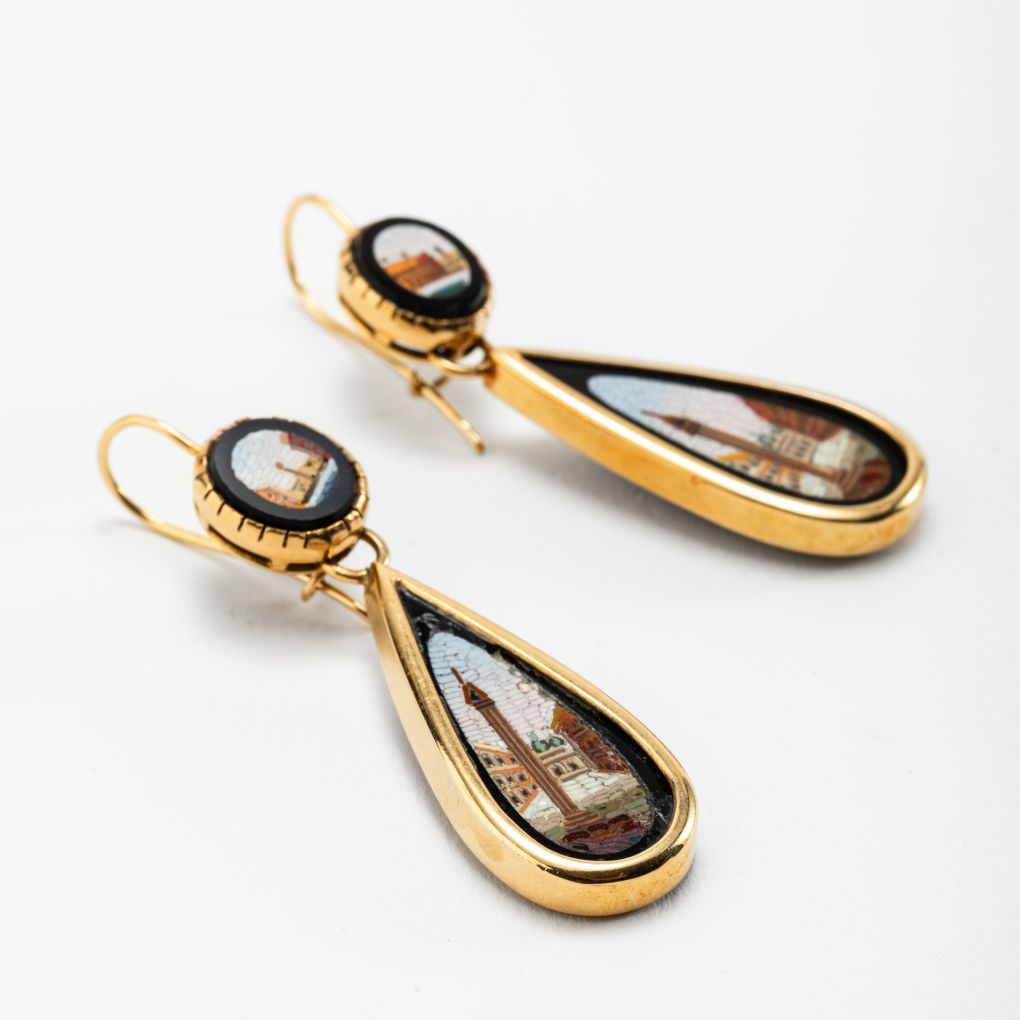 Earrings dating back to the end of the 9th century of Italian origin. Their structure is made of 18Kt (750‰) yellow gold with a hook clasp to make the pendants even safer and more stable. Unique jewels of fine handcrafted manufacture, these small micromosaics depict Piazza San Marco in Venice from three different perspectives: the famous St. Mark’s Bell Tower, the Sansovino Library, and the Column of St. Mark.