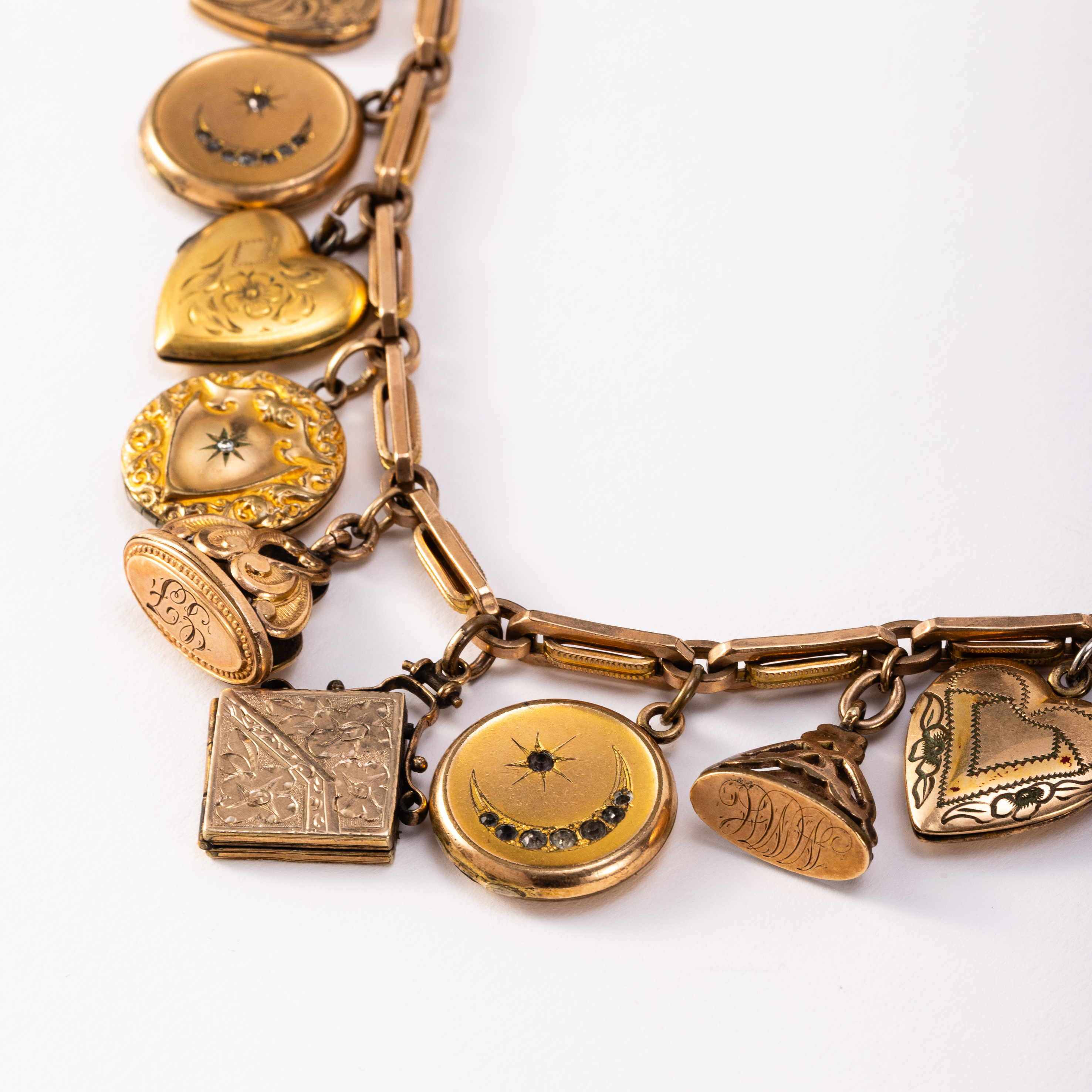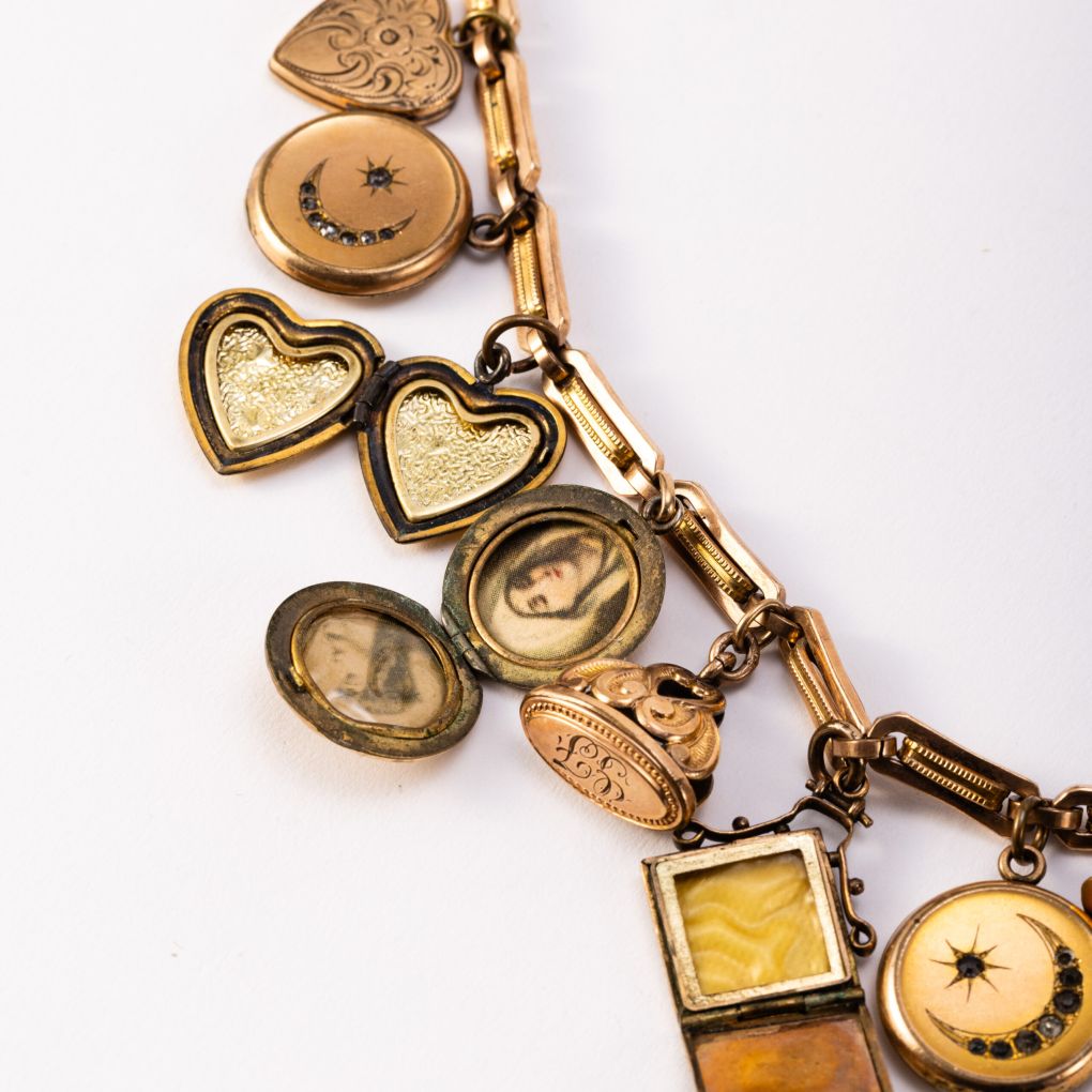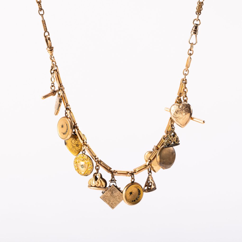 English necklace dating to the second half of the 19th century, crafted in antique 9Kt (375‰) gold. The piece was created by joining two watch chains, resulting in a distinctive and elegant composition. It features three seals—two of which are engraved with monograms—and nine casolé opening pendants, each revealing fine workmanship and intricate detail. A rare example of Victorian craftsmanship that combines functionality, symbolism, and ornamental beauty.