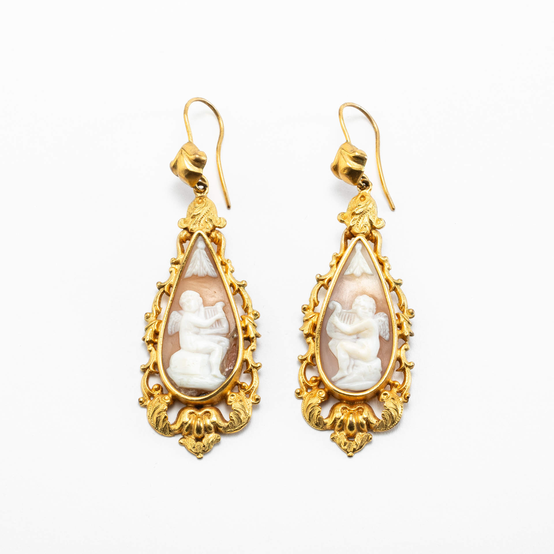 19th-century pendant earrings of Italian origin. Made of antique gold and shell, meticulously hand-engraved. Depicted are two mirrored angels playing the harp, framed by period-style workmanship.