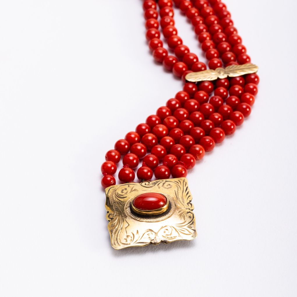 Early 20th-century bracelet of Italian provenance. The five strands of coral are composed of 164 spheres of Italian coral. There is a square clasp and other hand-engraved 18Kt yellow gold (750‰) clasps. The clasp is adorned with a central coral cabochon.