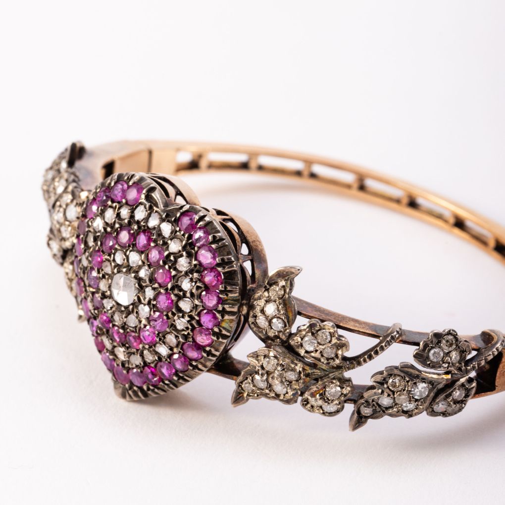 Exquisite rigid bracelet featuring a central heart motif adorned with natural rubies and diamonds. The sides are embellished with delicate floral designs, further enhanced by old-cut diamonds. Of English origin, this bracelet dates to the Victorian period, the second half of the 19th century. It is set with 39 rubies totaling approximately 1.60 carats (indirect measurement) and 89 old-cut diamonds totaling approximately 1.90 carats (indirect measurement). Crafted in 9Kt (375‰) rose gold and 925 silver, this jewel embodies the romantic elegance and refined craftsmanship characteristic of the Victorian era.