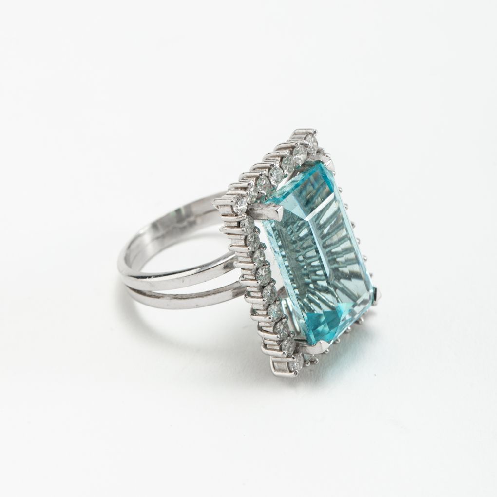 Ring featuring a natural emerald-cut aquamarine of 8.00 carats by indirect measurement. The structure is supported by 18Kt (750‰) white gold rays that give transparency and enhance the brilliance of the central stone. The aquamarine is framed by 30 selected brilliant-cut diamonds that create an even more crystalline effect. This unique 1930s piece shines with its own light and, through its geometric shapes, preserves a timeless design.