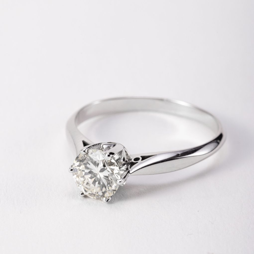 Ring of Italian origin from the second half of the 20th century. The setting is crafted in 18Kt (750‰) white gold, finely worked to give the ring its unique character. The centerpiece of this jewel is a brilliant-cut diamond weighing 0.95 carats (indirect measurement).