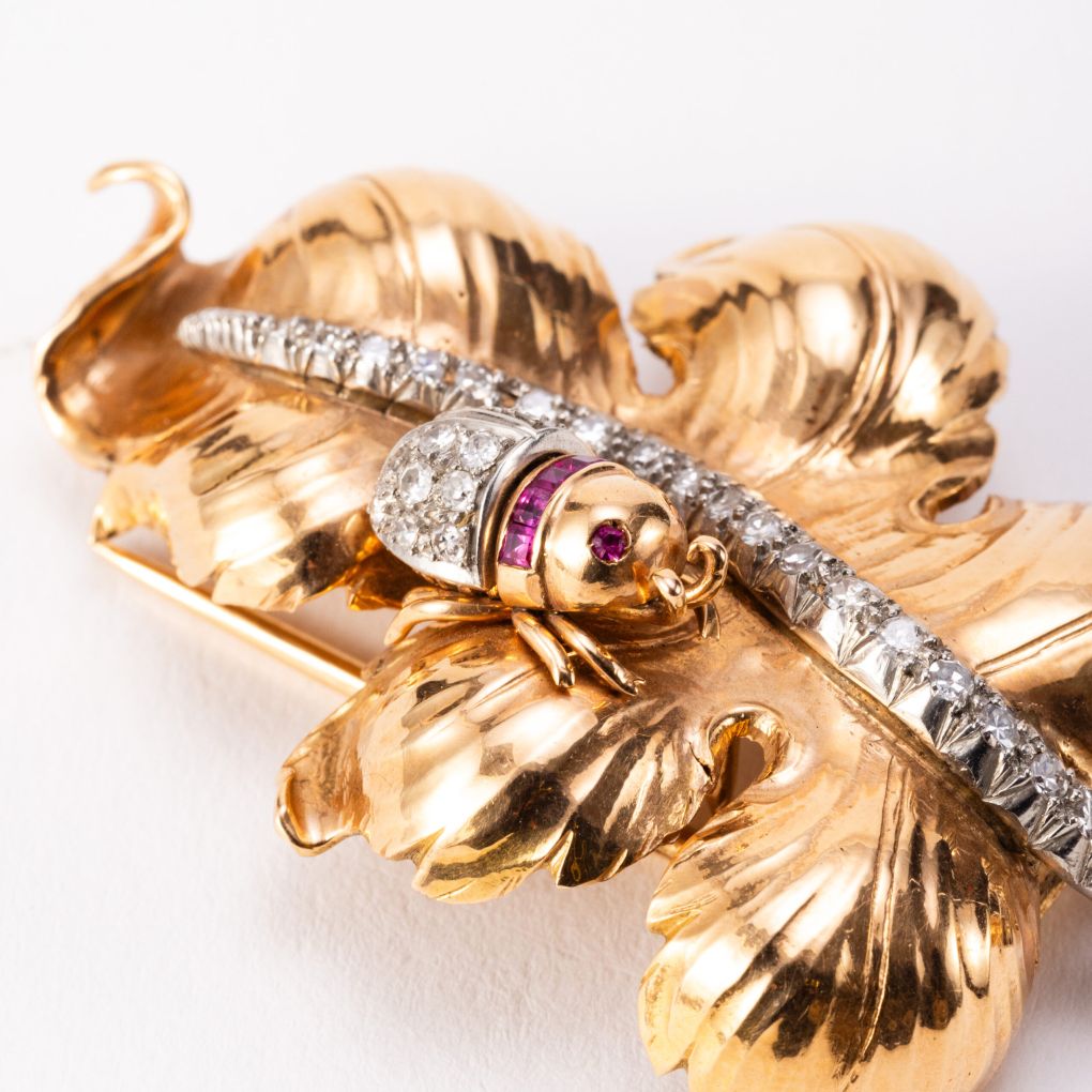 Brooch with double pin, shaped as a lobed leaf and crafted in 18Kt (750‰) yellow gold with a white gold stem. Adorned with 38 brilliant-cut diamonds, with a total estimated weight of 0.70 carats. A distinctive feature of this jewel is a delicate ladybird with a tremblant head, finely set with brilliant-cut diamonds and carré-cut rubies. A unique piece of Italian goldsmith craftsmanship dating back to the second half of the 20th century, entirely made with natural gemstones.