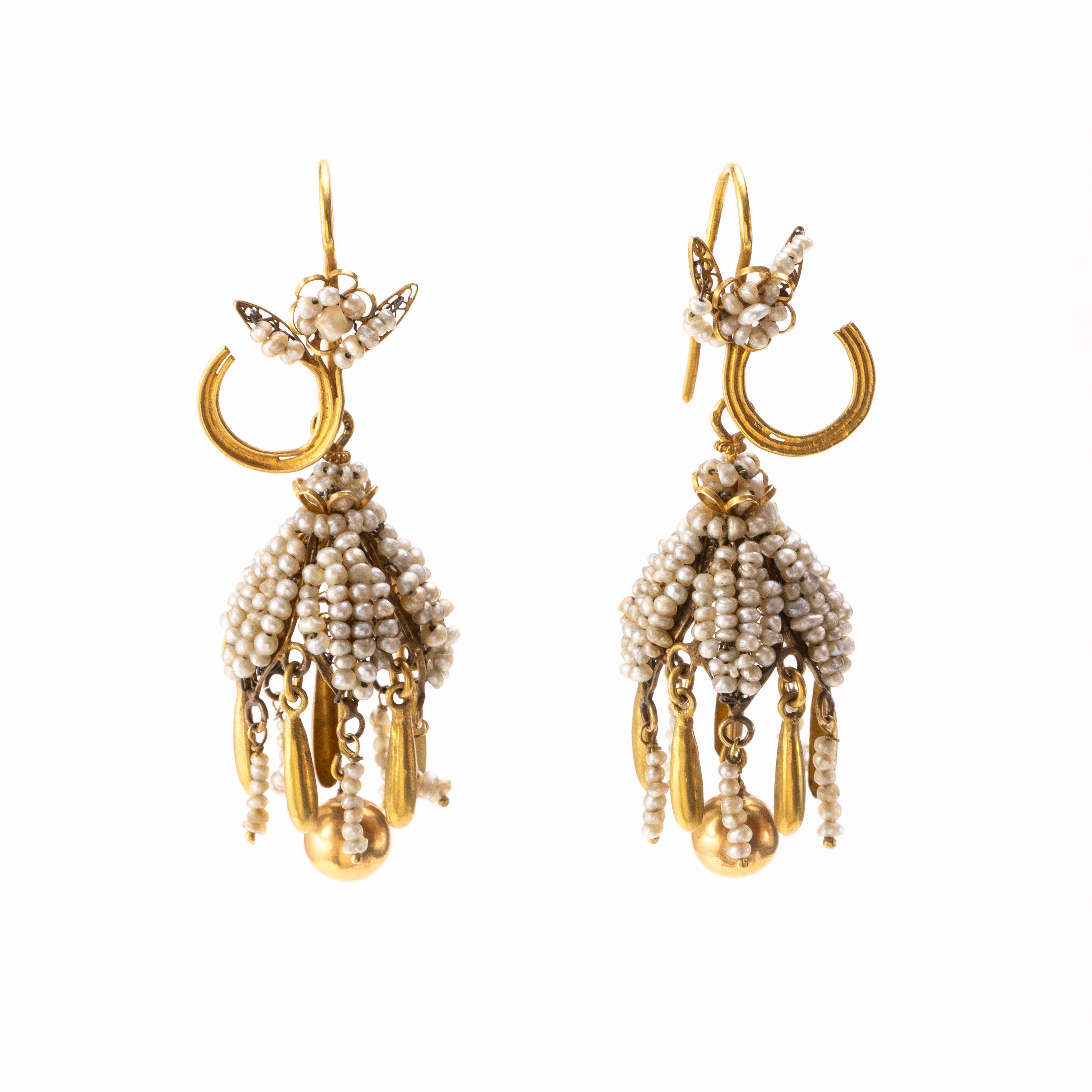 Refined bell-shaped earrings crafted in 18Kt (750‰) yellow gold, adorned with finely strung river micro pearls. The tiny pearls alternate with gold drops and a central sphere, creating a harmonious balance of color and material. An exquisite example of Italian craftsmanship dating to the late 19th century.