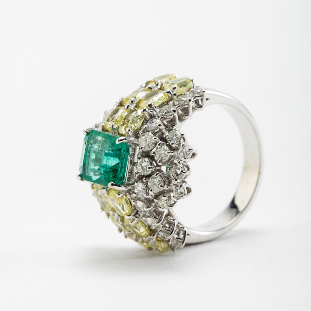Anello in Oro bianco con Diamanti colorless, fancy yellow e Smeraldo