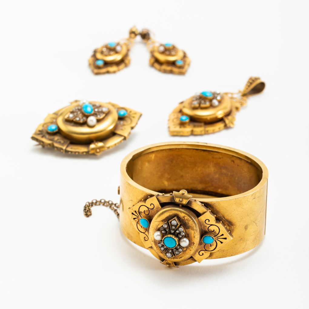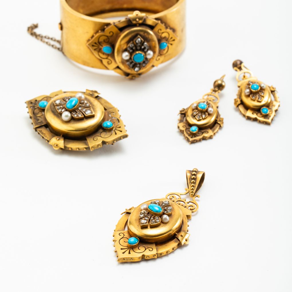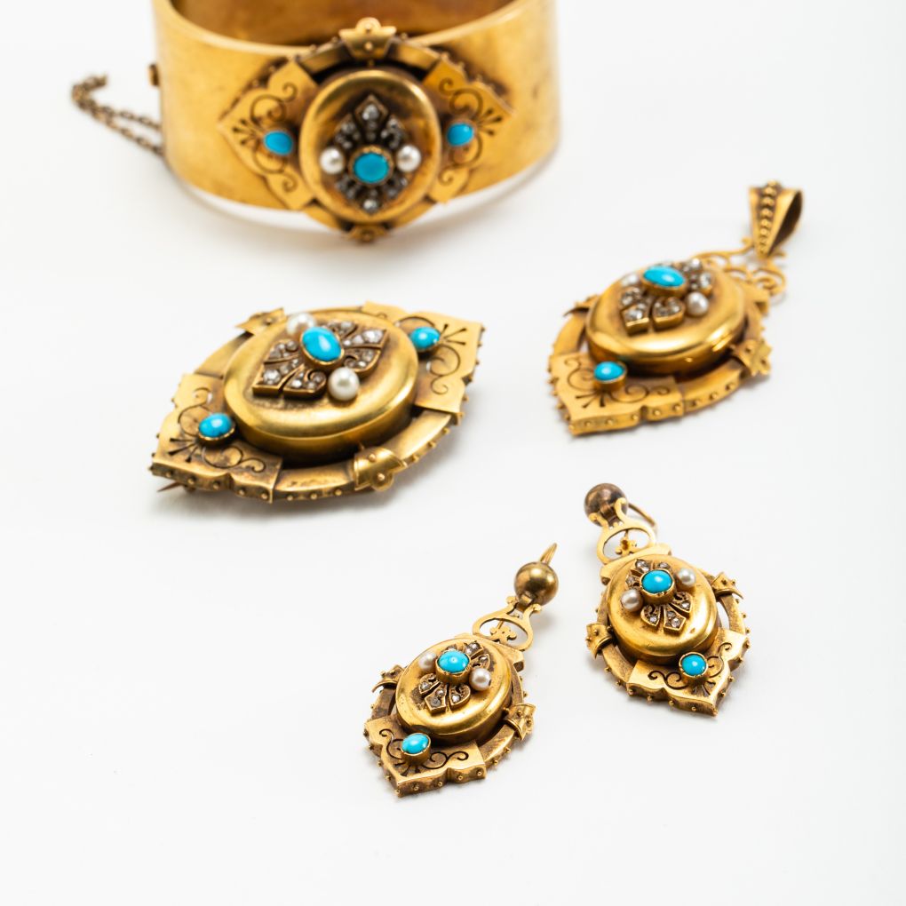 L’insieme di gioielli è composto da bracciale, spilla, orecchini, pendente ed è accompagnato dalla sua scatola originale dell’epoca. I vari pezzi sono realizzati in oro 9Kt (335‰) e sono ornati da un connubio di turchesi naturali, perline di fiume e diamanti a taglio antico.