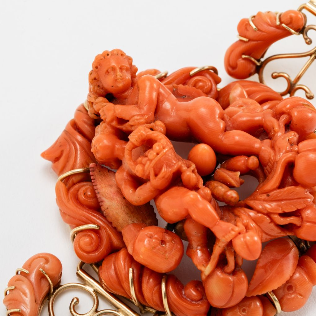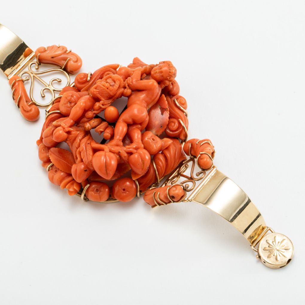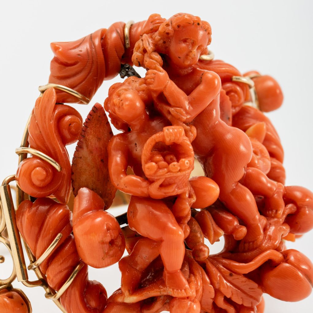 La chiusura è a cassetta con sicurezza a clip. In questa composizione artistica vi sono raffigurati due putti danzanti. Gli angioletti portano un cesto e una ghirlanda di frutta in segno di abbondanza, prosperità e benedizione. La cornice esterna del bracciale, ricca di frutta e intrecci di rami, crea un effetto ancora più tridimensionale al bracciale.