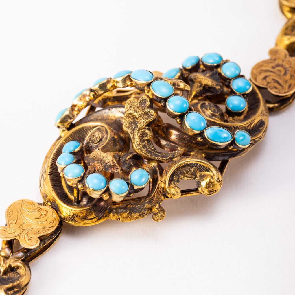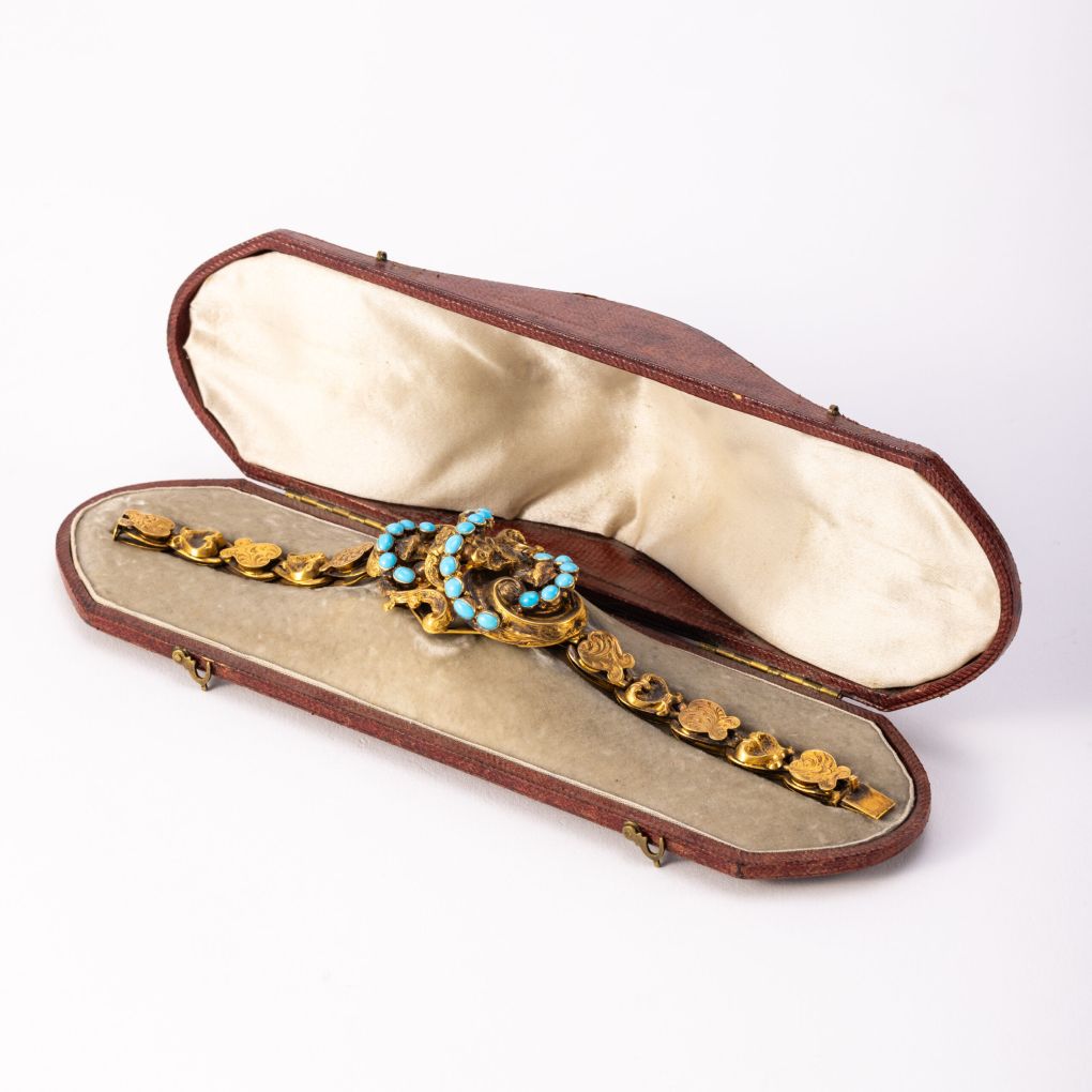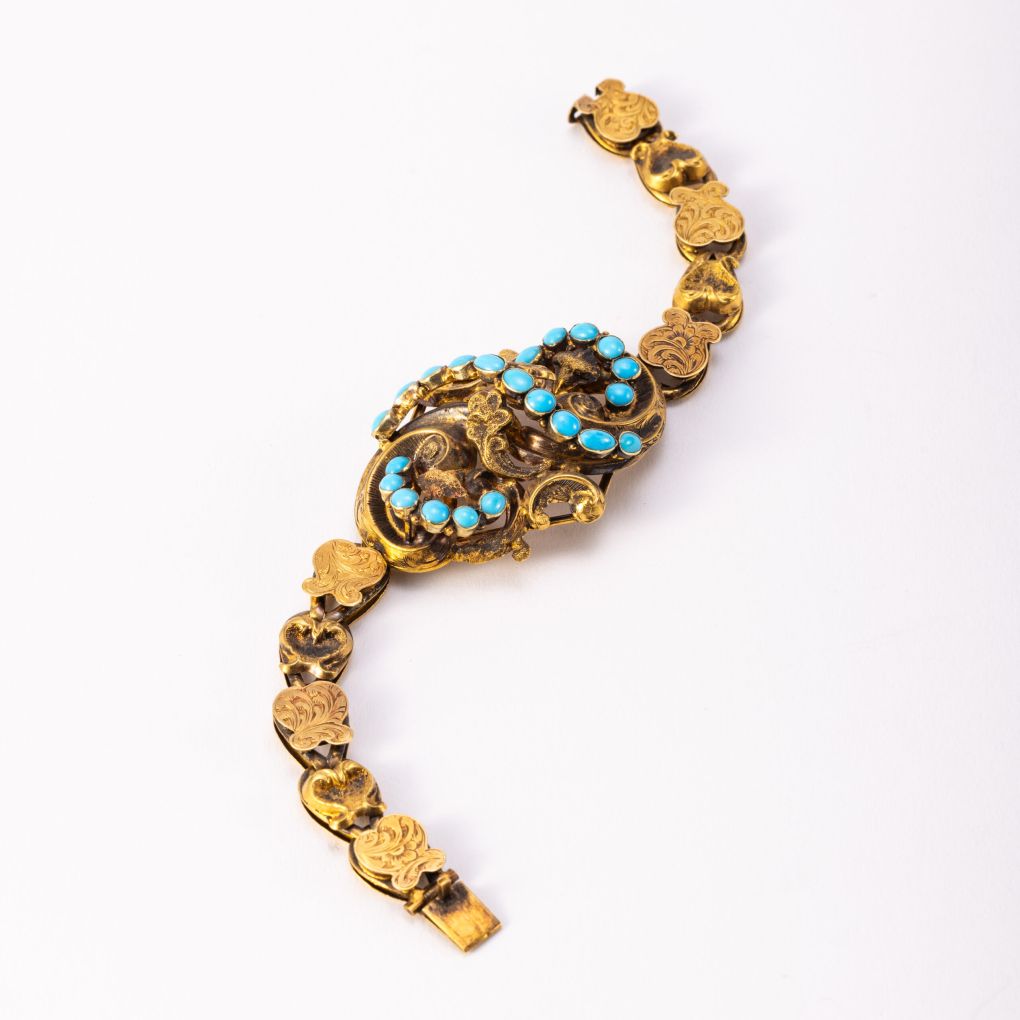 Bracciale d’epoca vittoriana realizzato in oro 9Kt (335‰) con elementi finemente incisi. Il centro del gioiello è completato da 22 turchesi naturali. Di provenienza inglese, questo raro pezzo è accompagnato dalla scatolina coeva, realizzata su misura per custodire il bracciale con la massima eleganza. Periodo seconda metà dell’Ottocento.