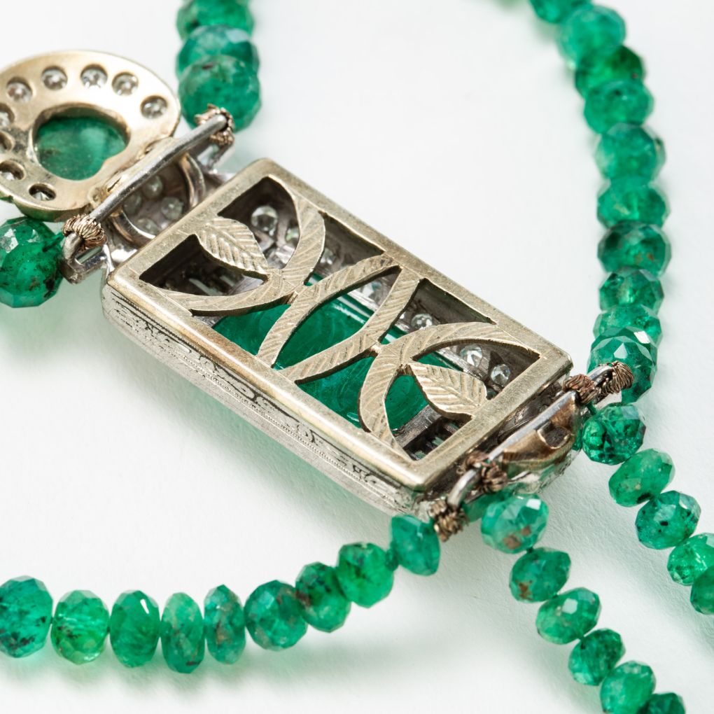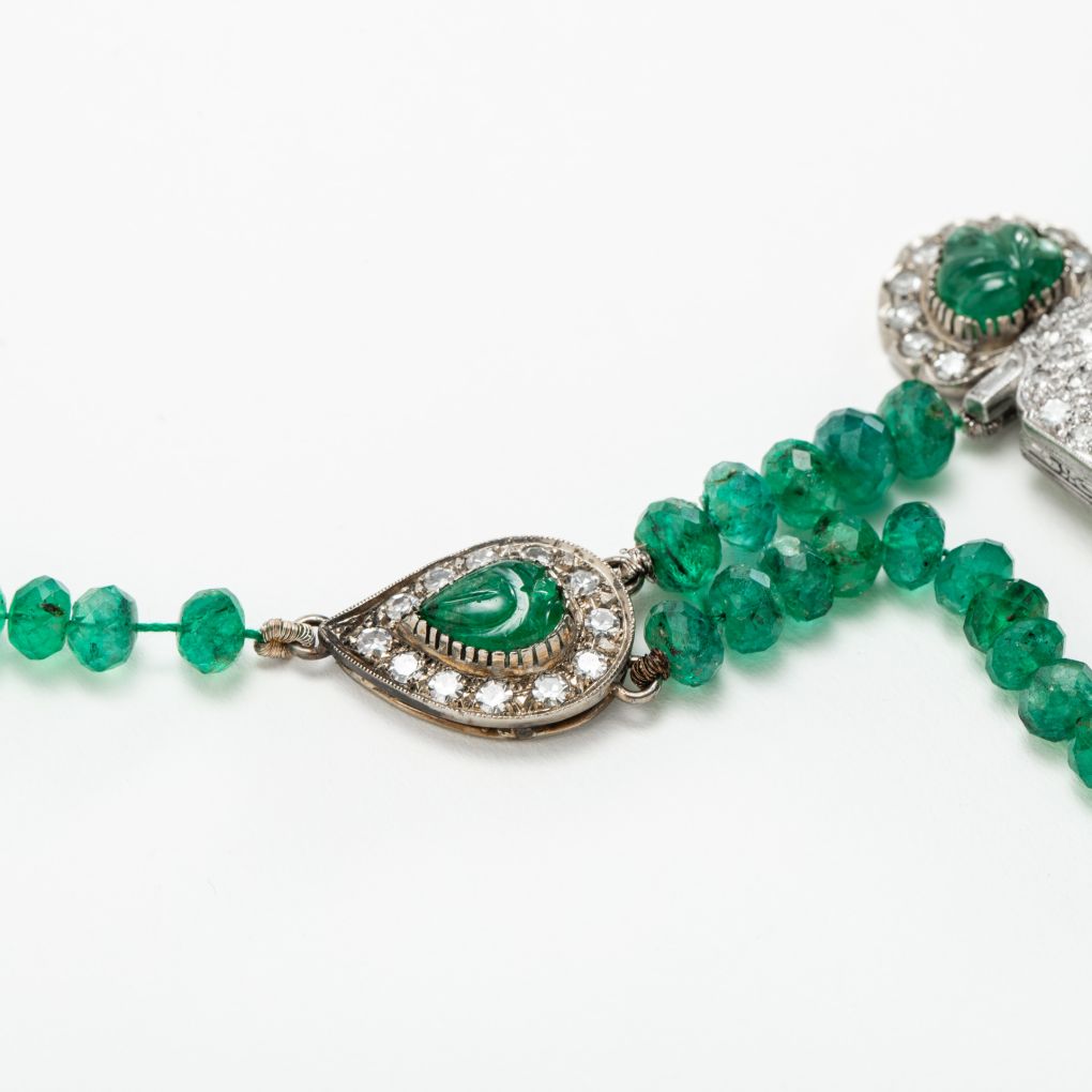 Questa collana unica nasce in pieno stile Liberty e porta con sé vari motivi ispirati dal mondo vegetale e floreale. La collana presenta 158 sfere sfaccettate, intagliate artigianalmente, per un totale complessivo di 31,6 carati di smeraldi naturali a misura indiretta. Al centro vi è uno smeraldo da 5 carati contornato di diamanti. Altri 5 smeraldi sono tagliati a forma ovale, a goccia e a forma di foglia, per un complessivo di 5,5 carati a misura indiretta.