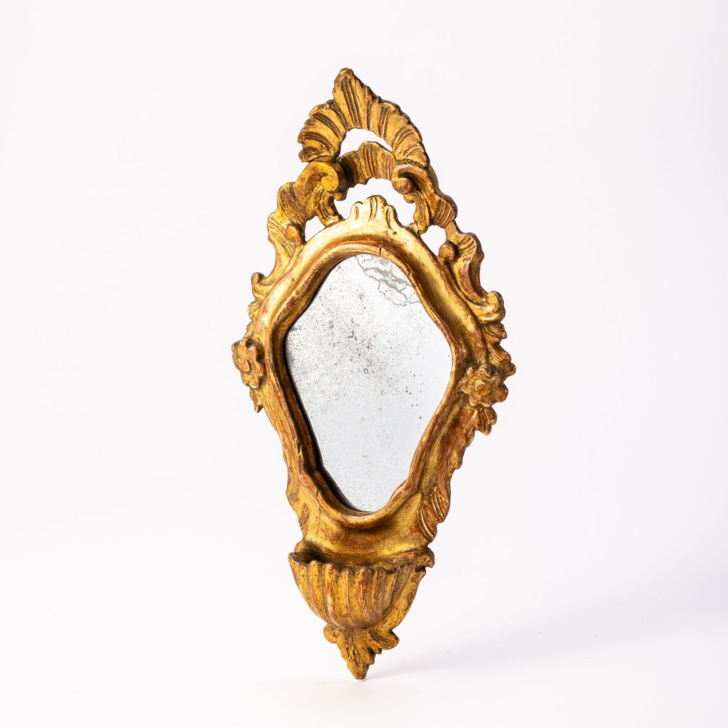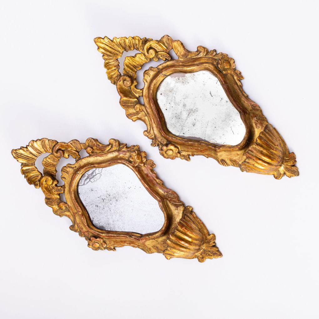 Coppia di acquasantiere Veneziane in legno dorato a foglia e specchi coevi epoca fine XVIII secolo. Conservate in ottime condizioni. Manifattura italiana. Gli specchi piombati sono originali.