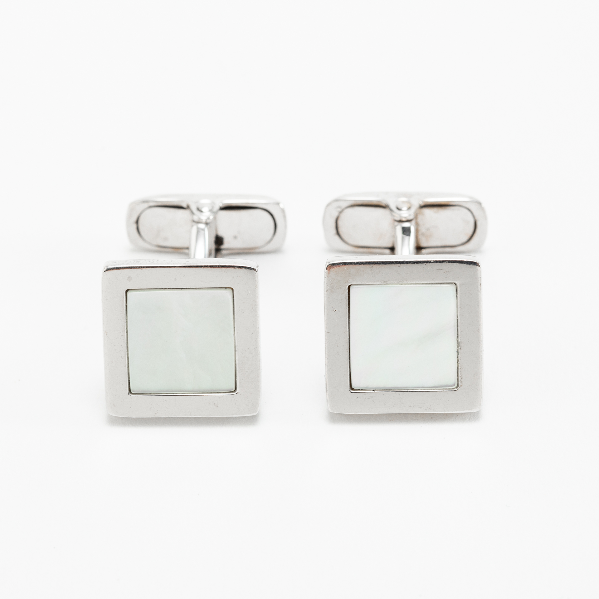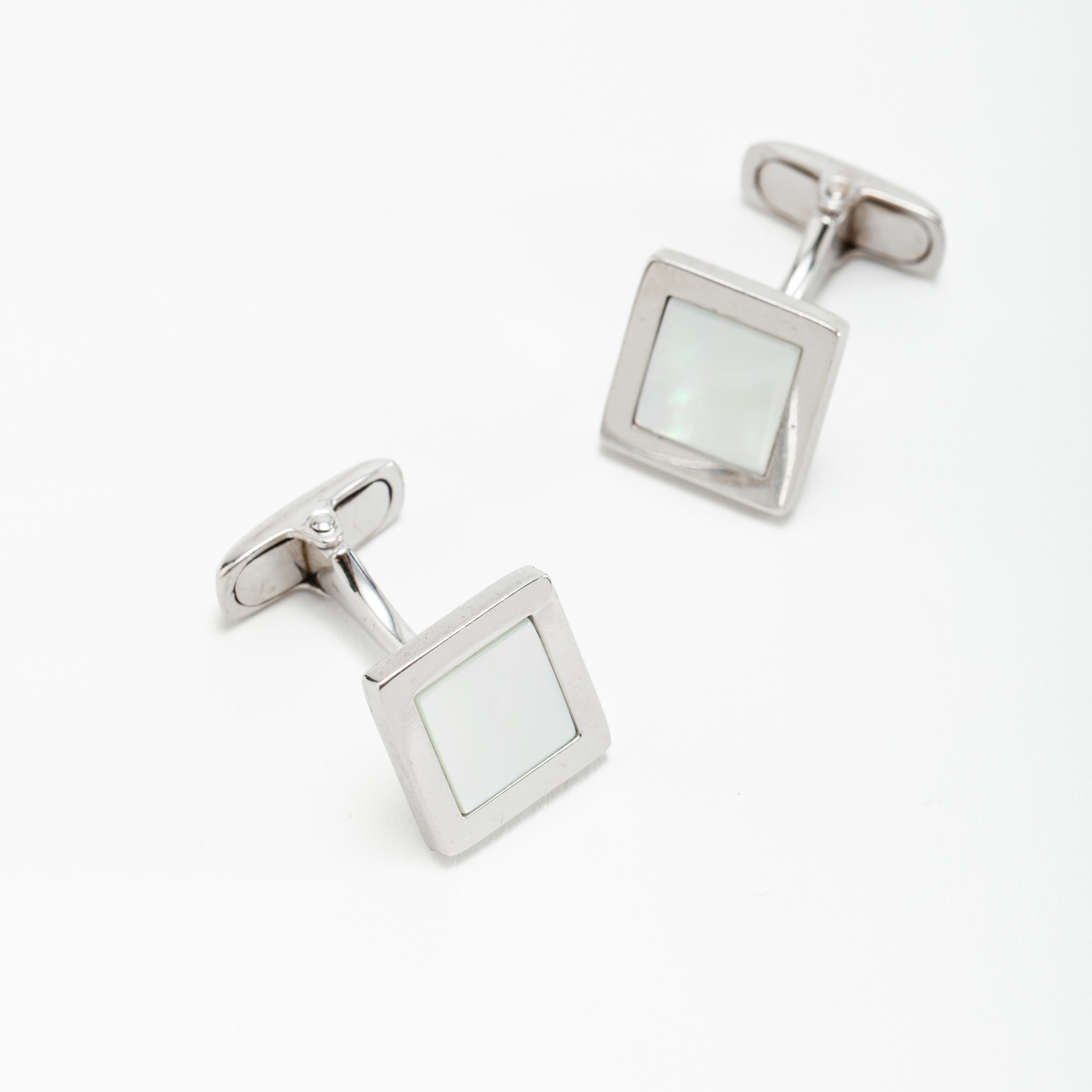 Gemelli da polso dalla forma quadrata realizzati alla fine del XX secolo. L’unione della madreperla con la montatura in oro bianco 18Kt (750‰) crea un effetto raffinato. La chiusura a scatto di questi gioielli li rende sicuri e facili da indossare.