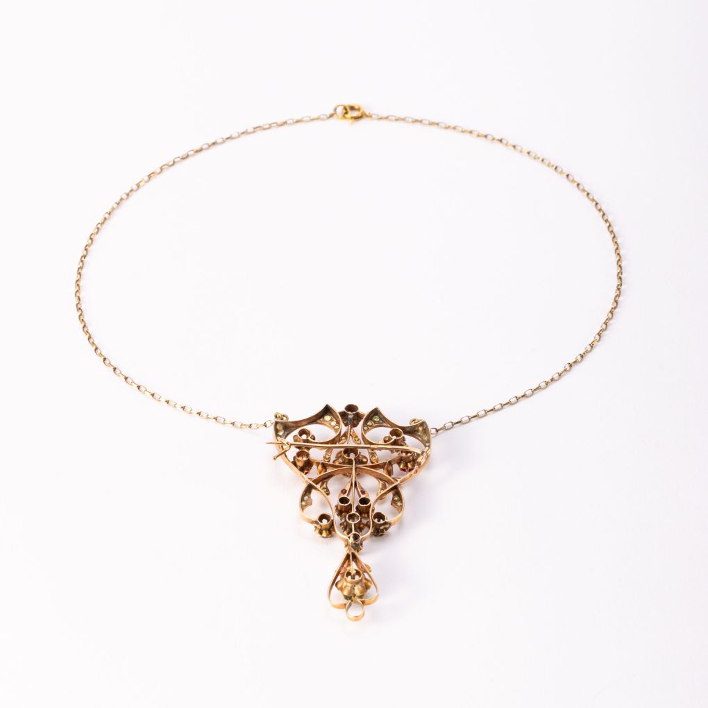 Collana in oro antico realizzata nella Russia Imperiale dello Zar Nicola II. L’oro 14Kt (583‰) era la lega standard nell’Impero Russo. Sul fianco della collana è presente un punzone dove è indicata la caratura dell’oro e la testa di San Giorgio che rappresentava la città di San Pietroburgo come centro di ispezione ufficiale dei metalli preziosi.