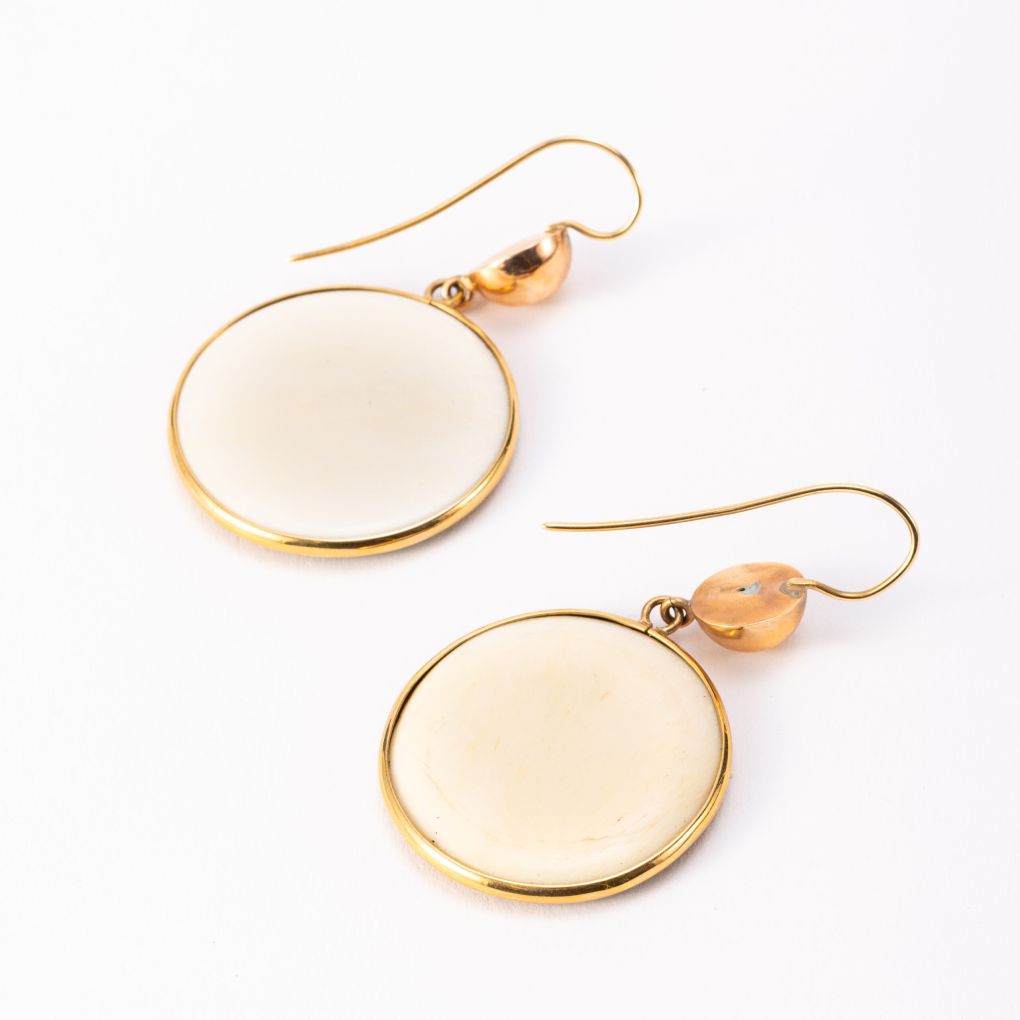 Antichi orecchini di provenienza italiana, risalenti alla fine del XIX secolo. Sono caratterizzati da due raffinate miniature dipinte a mano su osso. Sono raffigurati due piccoli putti alati con l’arco dell’amore. Questi gioielli unici sono ornati da cornici e semisfere a canna vuota in oro giallo 18Kt (750‰).
