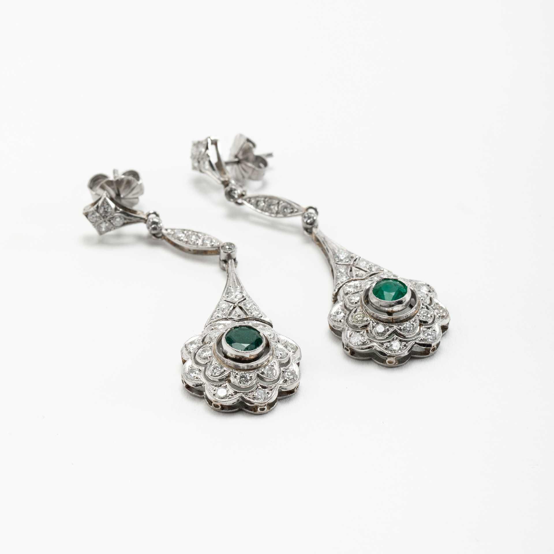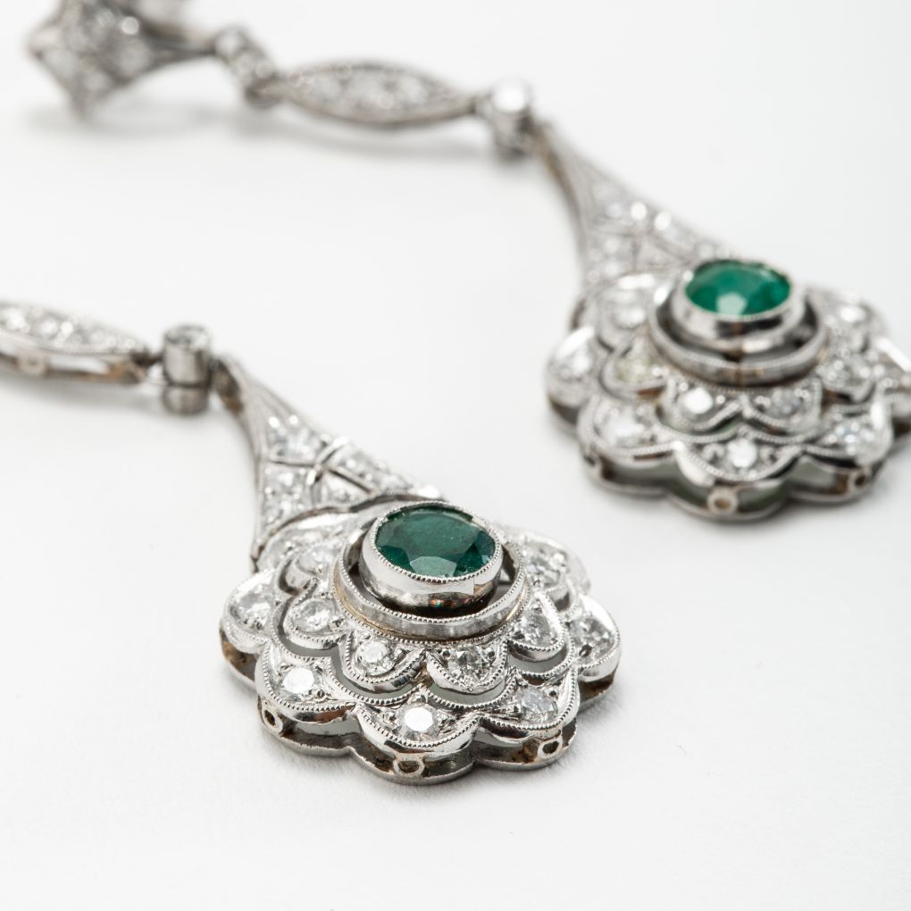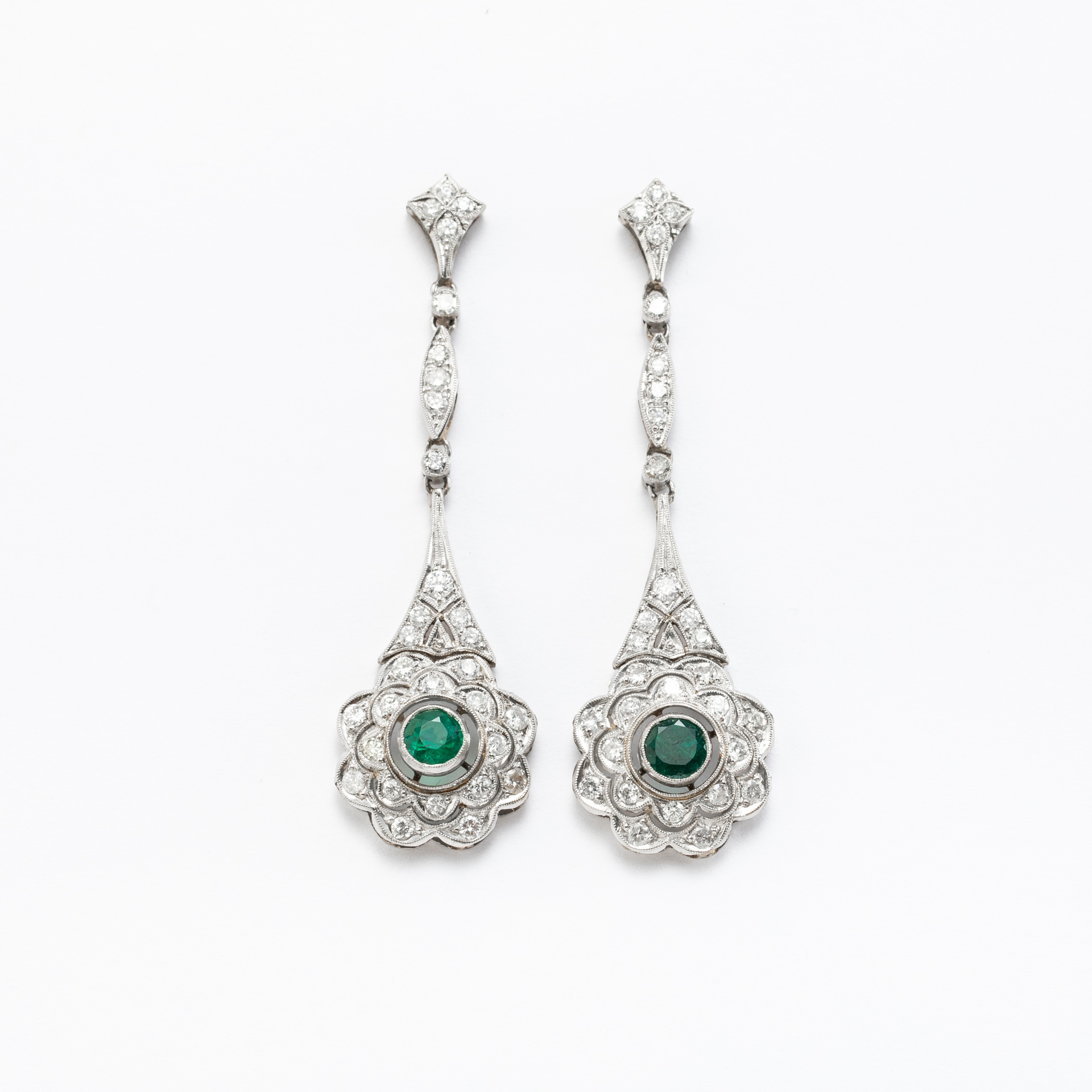 Orecchini in stile Liberty risalenti ai primi anni del XX secolo di provenienza italiana. Sono realizzati a mano in platino con chiusura a farfallina. Il motivo floreale viene messo in risalto dalla lucentezza dei diamanti e dal colore naturale degli smeraldi. Sono incastonati 60 diamanti a taglio brillante per un totale complessivo di 1,2 carati a misura indiretta e 2 smeraldi naturali da 0,50 carati totali a misura indiretta.